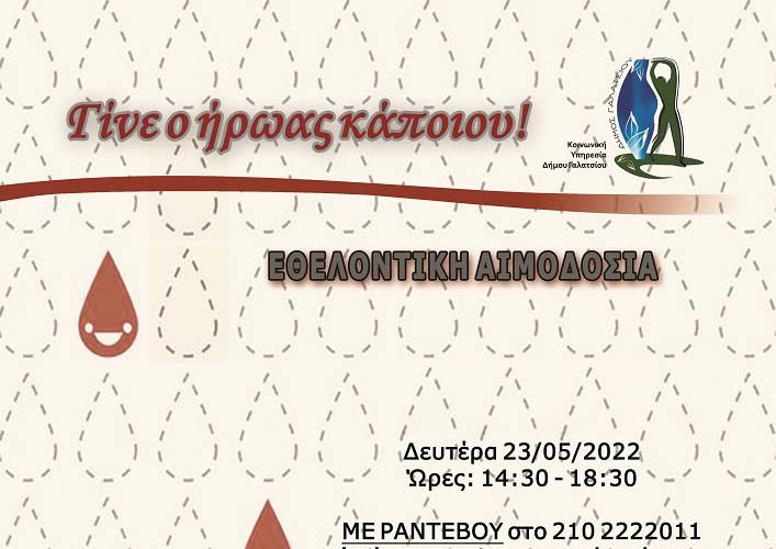 Ο Δήμος Γαλατσίου διοργανώνει Εθελοντική Αιμοδοσία τη Δευτέρα 23/05/2022 και ώρα 14:30 – 18:30, στο ισόγειο του Δημαρχείου κατόπιν ΡΑΝΤΕΒΟΥ στο 210.2222.011 ή στην ηλεκτρονική μας φόρμα: https://forms.gle/TDxXExJB6AoeqESA8?fbclid=IwAR0mhfbpwAUu7iLSwRctnW9Wqbq3LwtfYTKTizW-bgnV_CBVQ67uApjrE38
