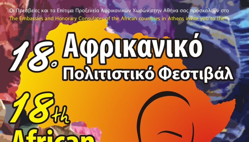 Οι Πρεσβείες και τα Επίτιμα Προξενεία των Αφρικανικών χωρών διαπιστευμένα στην Ελλάδα, σας προσκαλούν στο 18ο Αφρικανικό Πολιτιστικό Φεστιβάλ Γαστρονομίας, Μουσικής και Λαϊκής Τέχνης, που θα πραγματοποιηθεί στις 8 και 9 Ιουνίου 2019, Εξωτερικές εγκαταστάσεις Κλειστού Ολυμπιακού Σταδίου Γαλατσίου