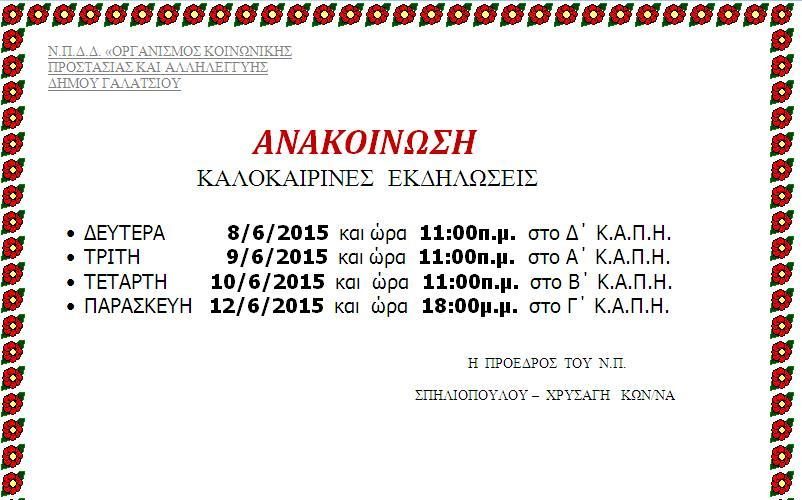 08/06/2015 - 12/6/2015 11:00 & 18:00 Διοργανωτής: Δήμος Γαλατσίου Καλοκαιρινό Φεστιβάλ