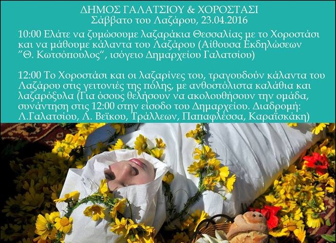 10:00: Ελάτε να ζυμώσουμε “λαζαράκια Θεσσαλίας” με το “ΧΟΡΟΣΤΑΣΙ” και να μάθουμε κάλαντα του Λαζάρου.