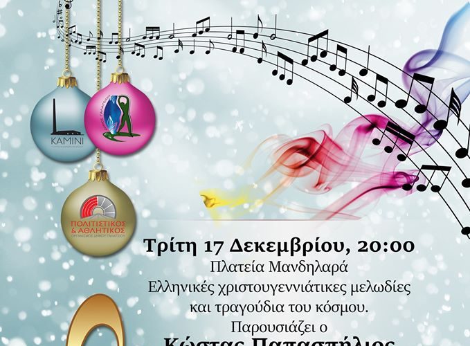 Ελληνικές χριστουγεννιάτικες μελωδίες και τραγούδια του κόσμου με τον Κώστα Παπασπήλιο, τον Μάνο Γιακουμή και την Πέρσα Σέργη. Από τις 19:30 face painting για μικρούς και μεγάλους! Κληρώσεις 20 γουριών, 20 δαχτυλιδιών, 20 μενταγιόν!Επιβιβαστείτε και αποβιβαστείτε, ελεύθερα, στο τρενάκι μας κι ελάτε. ΕΙΣΟΔΟΣ ΕΛΕΥΘΕΡΗ, όπως άλλωστε και σε όλες τις εκδηλώσεις.
