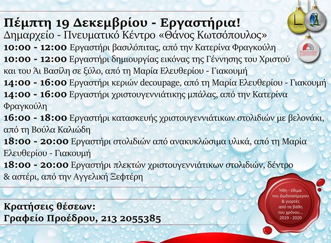 Σήμερα Πέμπτη 19.12.2019, 10:00 – 20:00, στο Δημαρχείο – Πνευματικό Κέντρο “Θάνος Κωτσόπουλος”