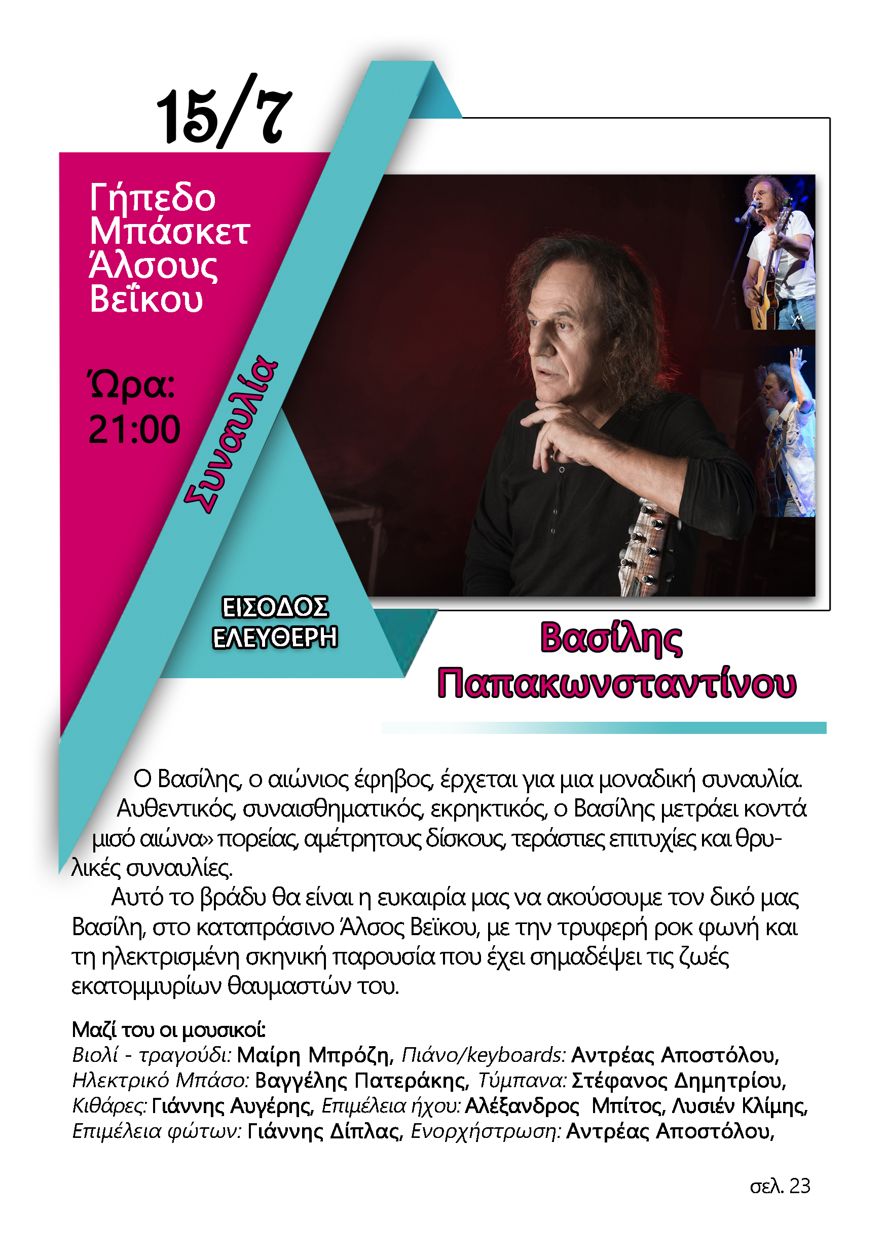 15/7/2019 21:00 Είσοδος Ελέυθερη Θέατρο Άλσους Βεΐκου Διοργανωτής: Πολιτιστικός και Αθλητικός Οργανισμός Δήμου Γαλατσίου "Βασίλης Παπαδιονυσίου" σε συνδιοργάνωση με τον Δήμο Γαλατσίου Καλοκαιρινό Φεστιβάλ