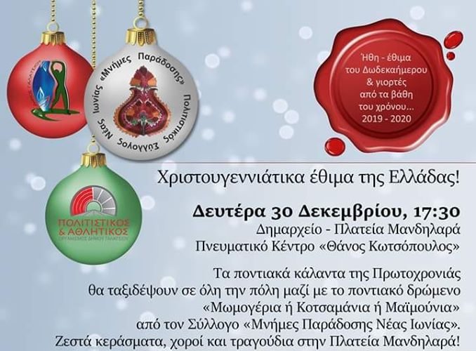 Απόψε 30.12.2019, 20:00 (μεταφορά λόγω βροχής) στο δημαρχείο – Πνευματικό Κέντρο “Θάνος Κωτσόπουλος” Μοναδικό δρώμενο, κάλαντα, χορός, εδέσματα, γλυκά…