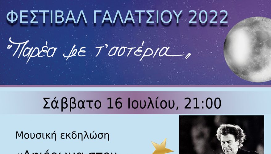 16/7/2022 21:00 ΕΛΕΥΘΕΡΗ ΕΙΣΟΔΟΣ Ανοιχτό Θέατρο Άλσους Βεΐκου Διοργανωτής: ΔΗΜΟΣ ΓΑΛΑΤΣΙΟΥ Καλοκαιρινό Φεστιβάλ