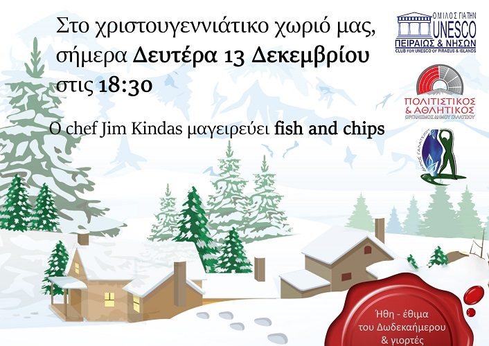 Σήμερα, Δευτέρα 13 Δεκεμβρίου 2021, στις 18:30 στο χριστουγεννιάτικο χωριό μας, ο chef Jim Kindas μαγειρεύει fish & chips και το προσφέρει ΔΩΡΕΑΝ, σε όλους!