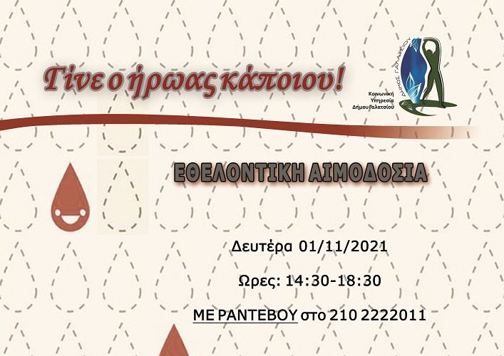 Ο Δήμος Γαλατσίου διοργανώνει Εθελοντική Αιμοδοσία τη Δευτέρα 01/11/2021 και ώρα 14:30-18:30 στο ισόγειο του Δημαρχείου κατόπιν ΡΑΝΤΕΒΟΥ