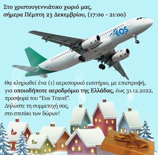 Στο χριστουγεννιάτικο χωριό μας, σήμερα Πέμπτη 23 Δεκεμβρίου, (17:00 – 21:00) Θα κληρωθεί ένα (1) αεροπορικό εισιτήριο, με επιστροφή, για οποιοδήποτε αεροδρόμιο της Ελλάδας, έως 31.12.2022, προσφορά του “Eos Travel”.