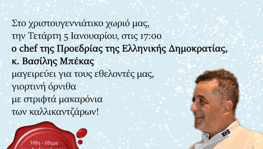 Στο χριστουγεννιάτικο χωριό μας, σήμερα, Τετάρτη 5 Ιανουαρίου, στις 17:00 ο chef της Προεδρίας της Ελληνικής Δημοκρατίας, κ. Βασίλης Μπέκας μαγειρεύει για τους εθελοντές μας, γιορτινή όρνιθα με στριφτά μακαρόνια των καλλικαντζάρων!