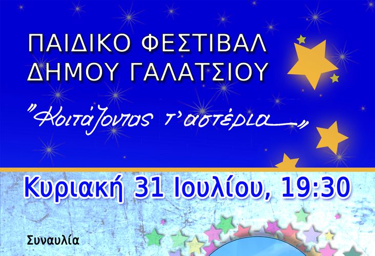 31/7/2022 19:30 ΕΛΕΥΘΕΡΗ ΕΙΣΟΔΟΣ Ανοιχτό Γήπεδο basket ΑΛΣΟΣ ΒΕΪΚΟΥ (είσοδος Β΄) Διοργανωτής: ΔΗΜΟΣ ΓΑΛΑΤΣΙΟΥ Παιδικό Φεστιβάλ