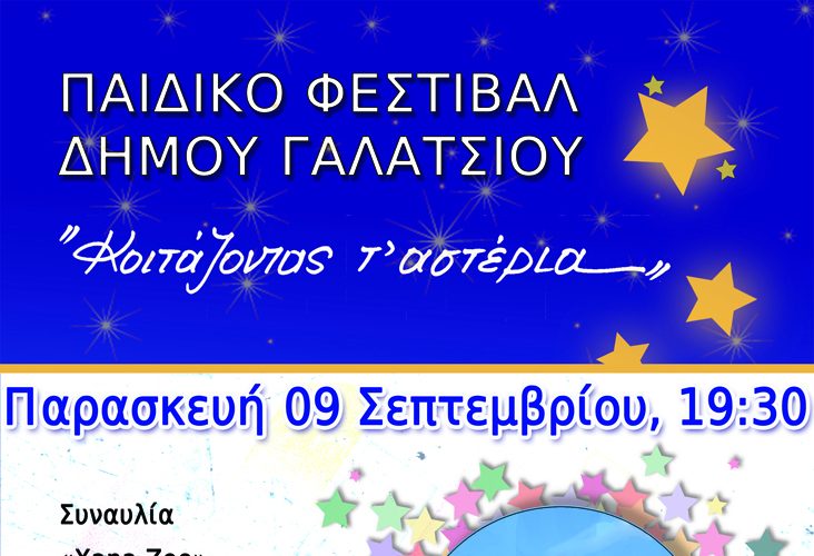 9/9/2022 19:30 ΕΛΕΥΘΕΡΗ ΕΙΣΟΔΟΣ Ανοιχτό Γήπεδο basket ΑΛΣΟΣ ΒΕΪΚΟΥ (είσοδος Β΄) Διοργανωτής: ΔΗΜΟΣ ΓΑΛΑΤΣΙΟΥ Παιδικό Φεστιβάλ