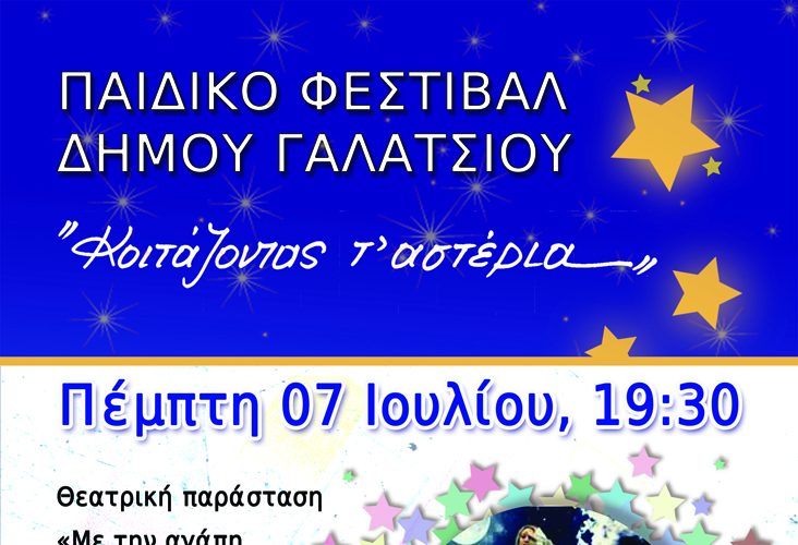7/7/2022 19:30 ΕΛΕΥΘΕΡΗ ΕΙΣΟΔΟΣ Ανοιχτό Γήπεδο basket ΑΛΣΟΣ ΒΕΪΚΟΥ (είσοδος Β΄) Διοργανωτής: ΔΗΜΟΣ ΓΑΛΑΤΣΙΟΥ Παιδικό Φεστιβάλ