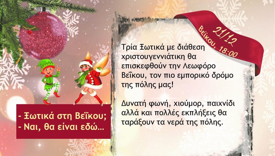 Τρία Ξωτικά με δυναμική διάθεση και όρεξη για διάδραση θα επισκεφθούν την Λεωφόρο Βεΐκου, τον πιο εμπορικό δρόμο της πόλης μας βάζοντάς μας για τα καλά στο κλίμα των γιορτών.