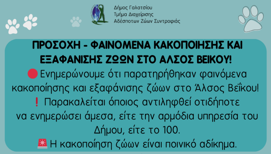 Ενημερώνουμε ότι παρατηρήθηκαν φαινόμενα κακοποίησης και εξαφάνισης ζώων στο Άλσος Βεΐκου!