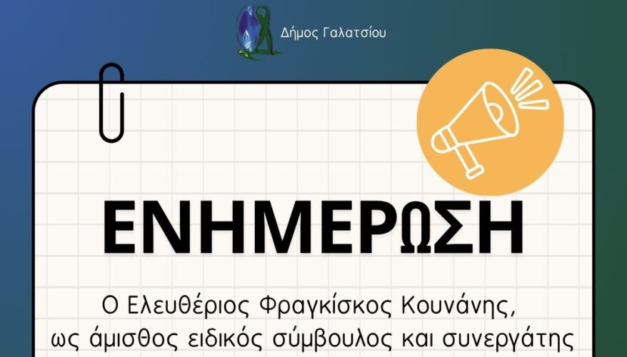 O Ελευθέριος Φραγκίσκος Κουνάνης, ως άμισθος ειδικός σύμβουλος και συνεργάτης του Δημάρχου Γαλατσίου θα βρίσκεται στον 3ο όροφο του Δημαρχείου Γαλατσίου, κάθε Τρίτη και Πέμπτη από τις 11:30 έως τις 15:30 για να εξυπηρετήσει τους πολίτες για θέματα καθημερινότητας.