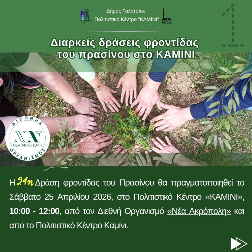 Η 24η δράση φροντίδας του πρασίνου θα πραγματοποιηθεί το Σάββατο 25 Απριλίου 2026, στις 10 το πρωί, στο «ΚΑΜΙΝΙ», από τον Διεθνή Οργανισμό Νέα Ακρόπολη Ελλάδας και το Πολιτιστικό Κέντρο Καμίνι.