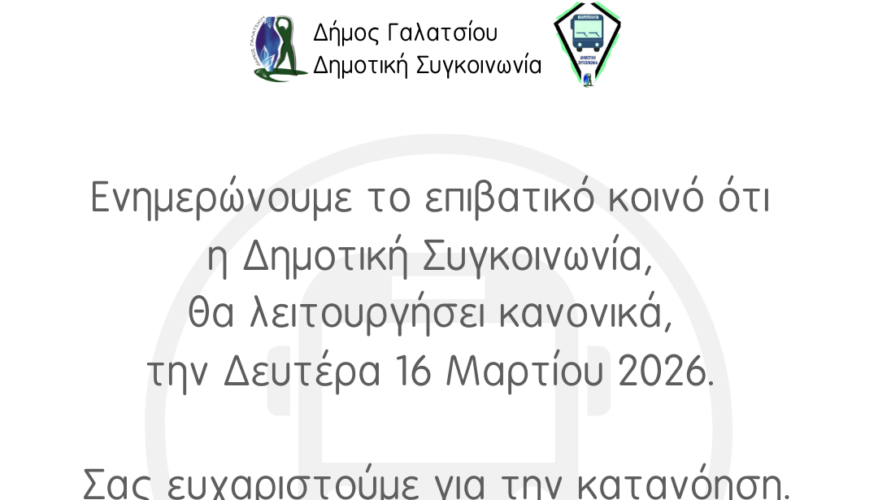 Ενημερώνουμε τους δημότες και τους χρήστες της Δημοτικής Συγκοινωνίας Γαλατσίου ότι τη Δευτέρα 16 Μαρτίου 2026, τα δρομολόγια θα διεξαχθούν κανονικά.