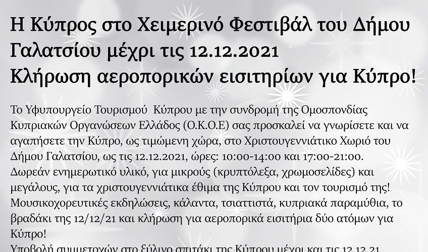 Η Κύπρος τιμώμενη χώρα στο χριστουγεννιάτικο χωριό μας, στις 12 Δεκεμβρίου με κλήρωση αεροπορικά εισιτήρια