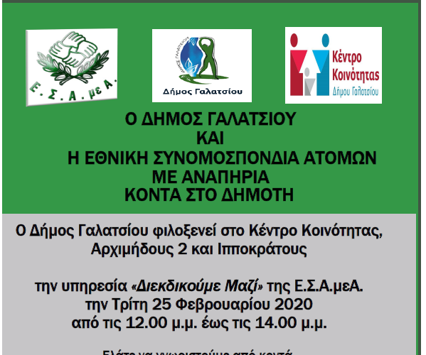 Η υπηρεσία «Διεκδικούμε μαζί» της Ε.Σ.Α.μεΑ στο Κέντρο Κοινότητας του Δήμου την Τρίτη 25 Φεβρουαρίου 2020