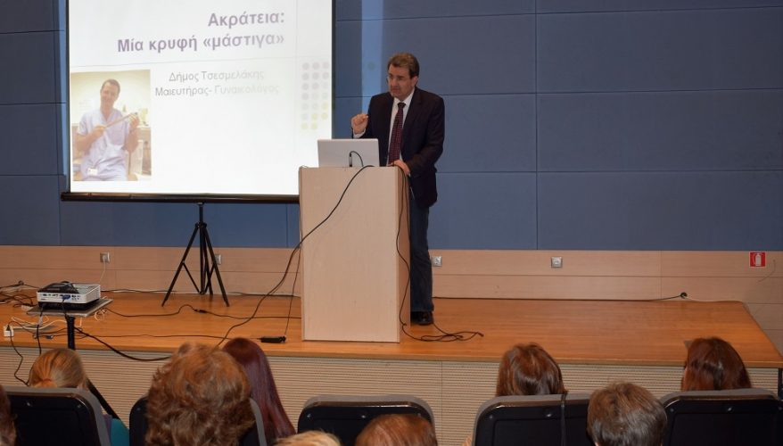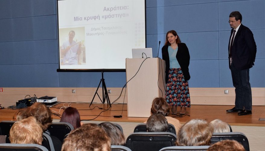 Ο Ιατρός, κ. Τσεσμελάκης, ανέπτυξε τους λόγους για τους οποίους προκαλείται η ακράτεια, τονίζοντας ότι είναι ένα πρόβλημα που αντιμετωπίζει μεγάλος αριθμός γυναικών και είναι θέμα ταμπού, καθώς οι περισσότερες γυναίκες δεν το αναφέρουν στο γιατρό τους, εκτός αν ο ειδικός θέσει συγκεκριμένες ερωτήσεις. Επίσης, επισήμανε ότι η αντιμετώπιση της ακράτειας στις περισσότερες περιπτώσεις μπορεί να αντιμετωπιστεί με μη χειρουργική λύση, καθώς με τη λήψη φαρμακευτικής αγωγής (ένα χάπι την ημέρα) και με ειδικές ασκήσεις ο ασθενής μπορεί να γλιτώσει από τη χρόνια ταλαιπωρία. Επίσης, ενημέρωσε το κοινό ότι σε καμία περίπτωση ο τοκετός δεν δημιουργεί ακράτεια.