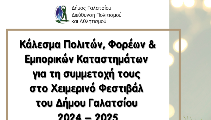 Η Διεύθυνση Πολιτισμού και Αθλητισμού του Δήμου Γαλατσίου, καλεί τους πολίτες, τους φορείς και τα εμπορικά καταστήματα, που ενδιαφέρονται να συμμετάσχουν ενεργά στο Χειμερινό Φεστιβάλ 2024 – 2025, να δηλώσουν το ενδιαφέρον τους για τη συμμετοχή τους στις εκδηλώσεις, καθώς και για χορηγίες με ανταποδοτικά οφέλη.