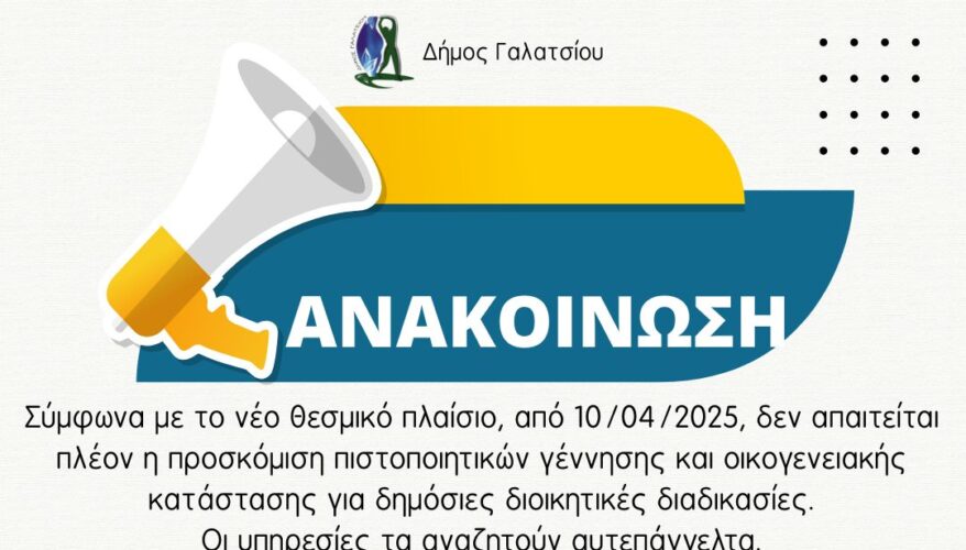 Σας ενημερώνουμε ότι, σύμφωνα με το νέο θεσμικό πλαίσιο (ν. 5099/2024 & ν. 5188/2025), από τις 10 Απριλίου 2025 καταργείται η υποχρέωση προσκόμισης πιστοποιητικών γέννησης και οικογενειακής κατάστασης για τη διεκπεραίωση διοικητικών διαδικασιών.
