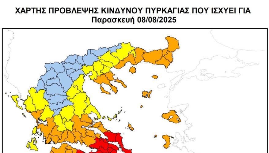 Κατάσταση συναγερμού για κίνδυνο εκδήλωσης πυρκαγιάς (κατηγορία 5) προβλέπεται για αύριο Παρασκευή 8 Αυγούστου 2025 στην Αττική, σύμφωνα με τον Χάρτη Πρόβλεψης Κινδύνου Πυρκαγιάς που εκδίδει η Γενική Γραμματεία Πολιτικής Προστασίας του Υπουργείου Κλιματικής Κρίσης & Πολιτικής Προστασίας (civilprotection.gov.gr).