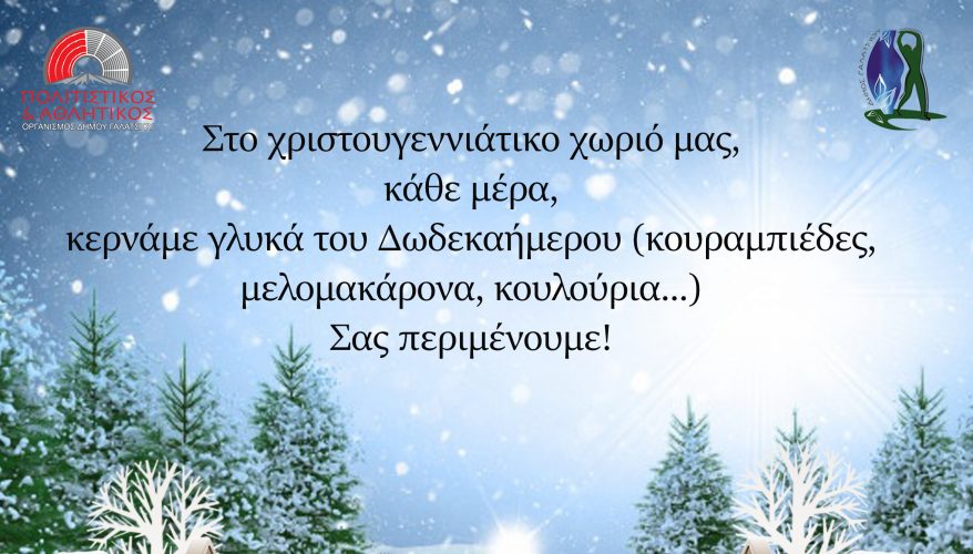 Στο χριστουγεννιάτικο χωριό του Δήμου Γαλατσίου (Παπαφλέσσα – Φαύνου – Κυμοθόης), κάθε μέρα, κερνάμε γλυκά του Δωδεκαήμερου (κουραμπιέδες, μελομακάρονα, κουλούρια…)