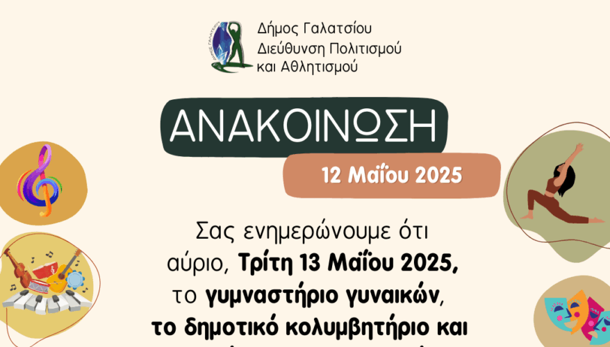 Σας ενημερώνουμε ότι αύριο, Τρίτη 13 Μαΐου 2025, το γυμναστήριο γυναικών (ΠΑΛΑΙ), το δημοτικό κολυμβητήριο (άλσος Βεΐκου) και το κέντρο καλλιτεχνικών δραστηριοτήτων & εκπαίδευσης θα παραμείνουν κλειστά, λόγω της εορτής της πολιούχου της πόλης μας, Αγίας Γλυκερίας.
