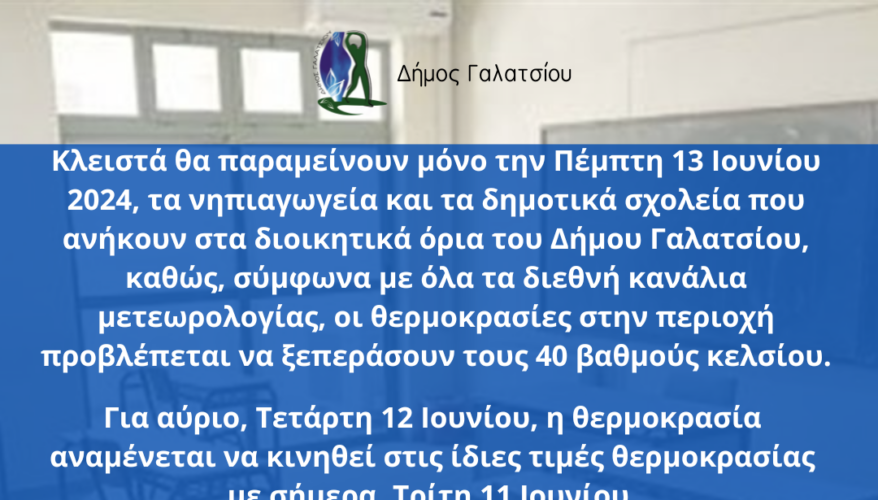 Κλειστά θα παραμείνουν την Πέμπτη 13 Ιουνίου 2024, τα νηπιαγωγεία και τα δημοτικά σχολεία που ανήκουν στα διοικητικά όρια του Δήμου Γαλατσίου, καθώς, σύμφωνα με όλα τα διεθνή κανάλια μετεωρολογίας,