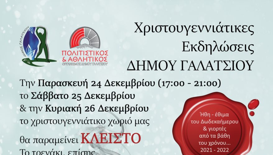 Την Παρασκευή 24 Δεκεμβρίου (17:00 – 21:00), το Σάββατο 25 Δεκεμβρίου και την Κυριακή 26 Δεκεμβρίου 2021, το χριστουγεννιάτικο χωριό του Δήμου Γαλατσίου (Παπαφλέσσα -Κυμοθόης – Φαύνου) θα παραμείνει ΚΛΕΙΣΤΟ. Το τρενάκι, επίσης, δε θα πραγματοποιήσει δρομολόγια.