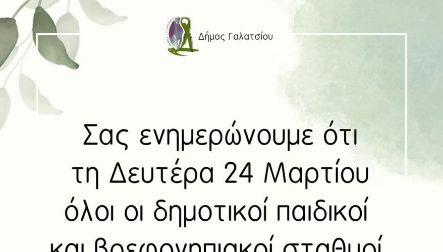 Σας ενημερώνουμε ότι τη Δευτέρα 24 Μαρτίου 2025, όλοι οι δημοτικοί βρεφονηπιακοί και παιδικοί σταθμοί Γαλατσίου θα παραμείνουν κλειστοί λόγω πένθους.