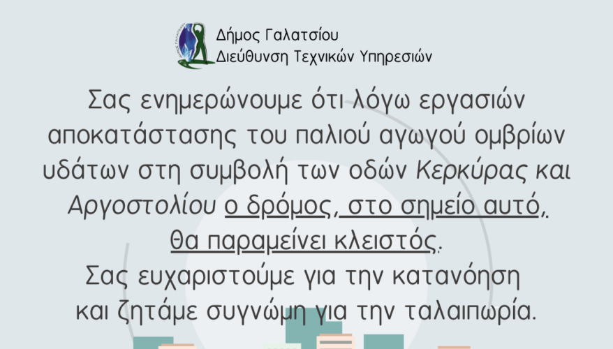 Κλειστός ο δρόμος, στη συμβολή των οδών Κερκύρας κι Αργοστολίου, λόγω εργασιών αποκατάστασης αγωγού ομβρίων υδάτων