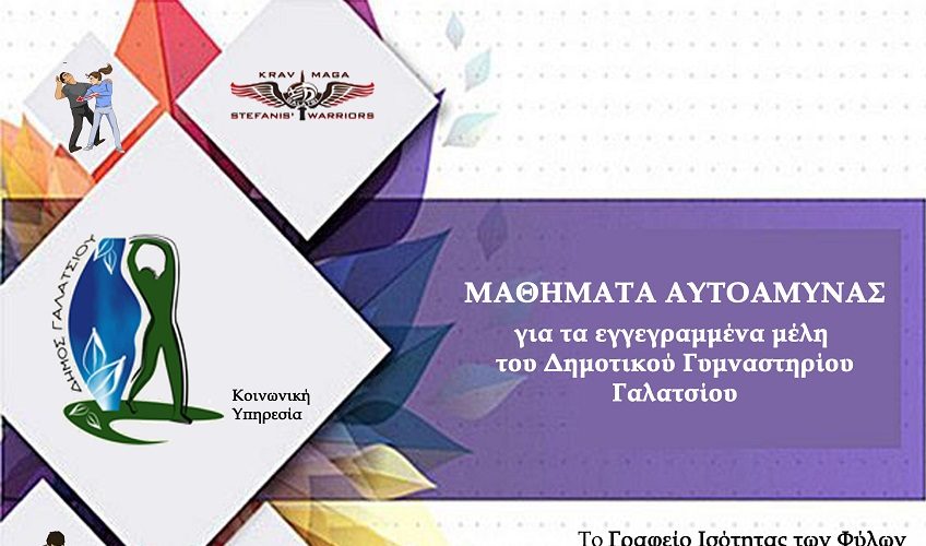 Το Γραφείο Ισότητας των Φύλων της Διεύθυνσης Κοινωνικής Πολιτικής και Υγείας σε συνεργασία με τον Πολιτιστικό και Αθλητικό Οργανισμό Δήμου Γαλατσίου “ΒΑΣΙΛΗΣ ΠΑΠΑΔΙΟΝΥΣΙΟΥ” οργανώνουν μαθήματα αυτοάμυνας για τις εγγεγραμμένες γυναίκες και τα εγγεγραμμένα κορίτσια του Δημοτικού Γυμναστηρίου.