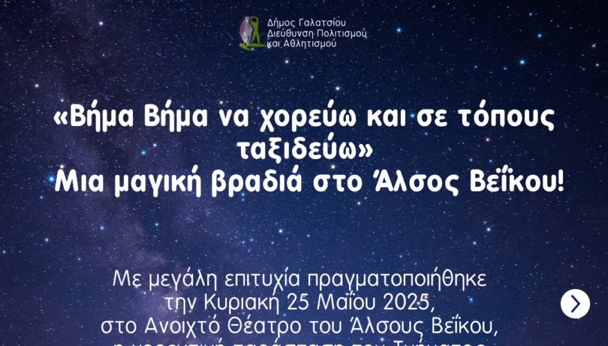 Με μεγάλη επιτυχία πραγματοποιήθηκε την Κυριακή 25 Μαΐου 2025, στο Ανοιχτό Θέατρο του Άλσους Βεΐκου, η χορευτική παράσταση του Τμήματος Παραδοσιακών Χορών του Κέντρου Καλλιτεχνικών Δραστηριοτήτων και Εκπαίδευσης του Δήμου Γαλατσίου.