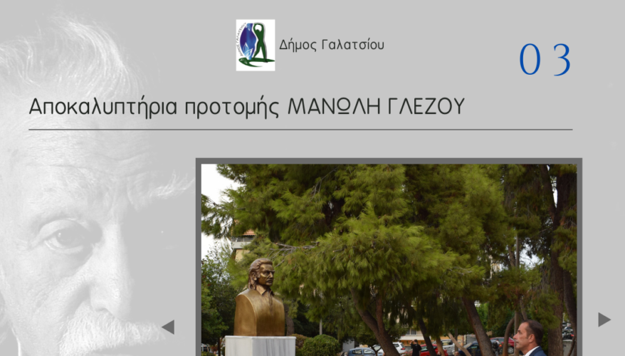Ο Δήμος Γαλατσίου με ιδιαίτερη τιμή και συγκίνηση πραγματοποίησε τα αποκαλυπτήρια της προτομής του σπουδαίου αγωνιστή της ελευθερίας και της δημοκρατίας, Μανώλη Γλέζου, σε ειδική τελετή που έλαβε χώρα τη Δευτέρα 9 Σεπτεμβρίου 2024, στην  ομώνυμη πλατεία της πόλης μας (Παπαφλέσσα, Κυμοθόης, Σαπφούς, Πανδώρας).