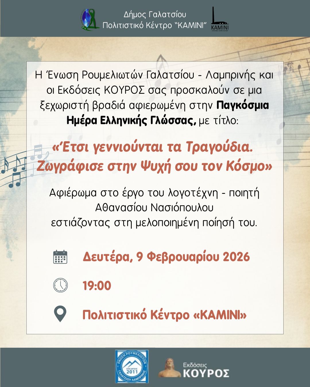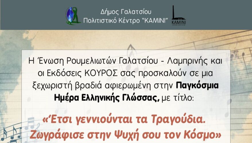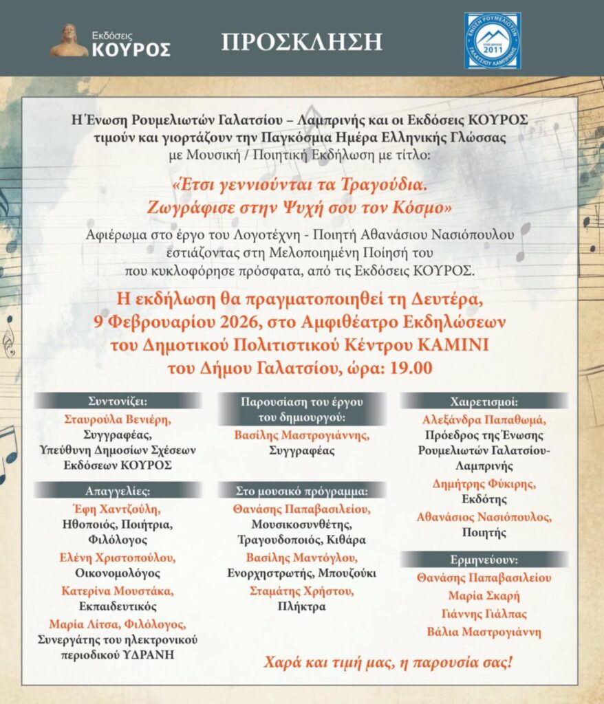 Μουσική-ποιητική εκδήλωση «Έτσι γεννιούνται τα τραγούδια. Ζωγράφισε στην ψυχή σου τον κόσμο», τη Δευτέρα 9 Φεβρουαρίου 2026, στις 19:00, στο ΚΑΜΙΝΙ, από την Ένωση Ρουμελιωτών Γαλατσίου-Λαμπρινής και τις εκδόσεις ΚΟΥΡΟΣ