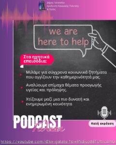Νέα σειρά με ηχητικά επεισόδια (podcast) από τη Διεύθυνση Κοινωνικής Πολιτικής και Υγείας, στα οποία συζητούνται σύγχρονα κοινωνικά ζητήματα, θέματα προαγωγής δημόσιας υγείας και πρόληψης