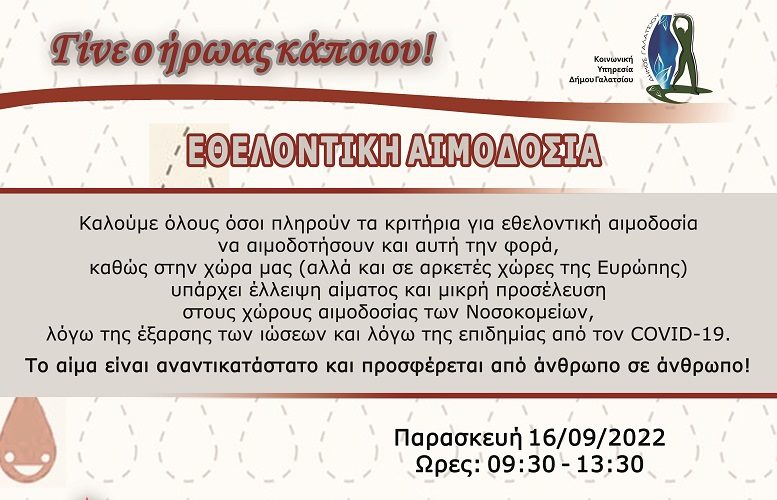 Ο Δήμος Γαλατσίου διοργανώνει εθελοντική αιμοδοσία την Παρασκευή 16 Σεπτεμβρίου 2022 και ώρα 9:30 – 13:30, στο ισόγειο του Δημαρχείου, κατόπιν ΡΑΝΤΕΒΟΥ στο 210.2222011 ή στην ηλεκτρονική μας φόρμα: https://forms.gle/VsB36TbyBbauSkEcA
