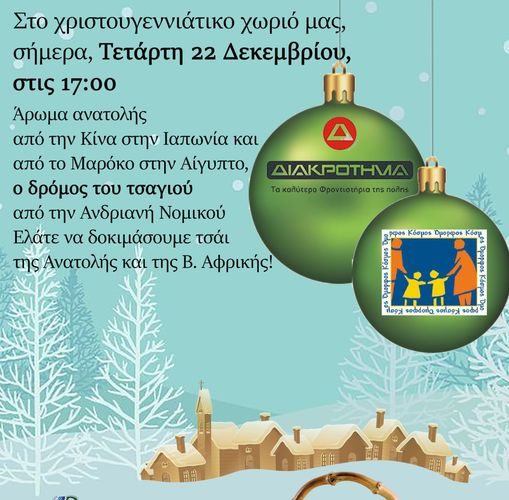Στο χριστουγεννιάτικο χωριό μας, σήμερα, Τετάρτη 22 Δεκεμβρίου, στις 17:00 Άρωμα ανατολής από την Κίνα στην Ιαπωνία και από το Μαρόκο στην Αίγυπτο, ο δρόμος του τσαγιού από την Ανδριανή Νομικού