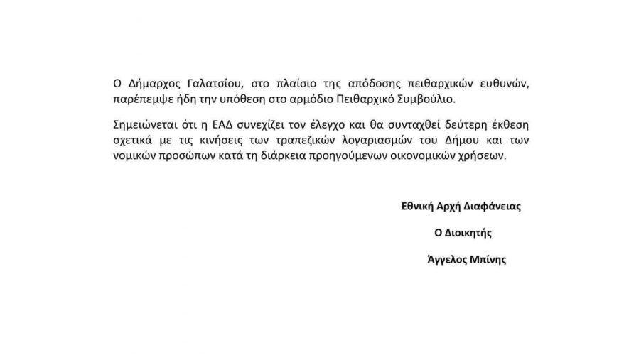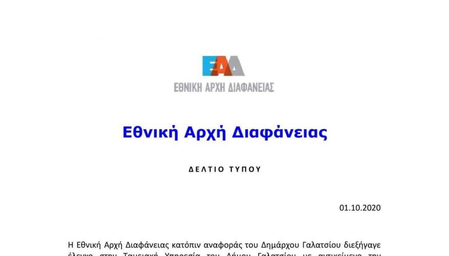 Κατόπιν αναφοράς και προσωπικών ενεργειών του Δημάρχου Γαλατσίου, Γιώργου Μαρκόπουλου η Εθνική Αρχή Διαφάνειας διεξήγαγε έλεγχο στην Ταμειακή Υπηρεσία του Δήμου Γαλατσίου, με αντικείμενο τη διερεύνηση υπόθεσης που αφορά σε αντιστοιχίες κινήσεων τραπεζικών λογαριασμών του Δήμου προς τους λογαριασμούς των νομικών προσώπων «Οργανισμός Κοινωνικής Προστασίας και Αλληλεγγύης Δήμου Γαλατσίου» και «Πολιτιστικός και Αθλητικός Οργανισμός Δήμου Γαλατσίου – Βασίλης Παπαδιονυσίου», αναλήψεις από τους τραπεζικούς λογαριασμούς που δεν δικαιολογούνται από αντίστοιχες πληρωμές δαπανών του Δήμου και ταυτόχρονα έκδοση ταμειακών παραστατικών που δεν αντιστοιχούν σε πραγματικές κινήσεις των τραπεζικών λογαριασμών, με αποτέλεσμα την εμφάνιση σημαντικού ελλείμματος ύψους 255.000€