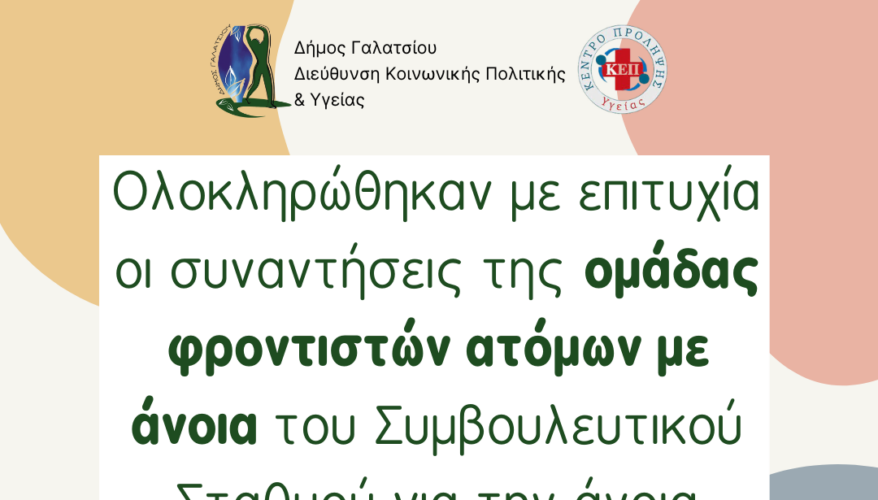 Υπενθυμίζουμε ότι ο Συμβουλευτικός Σταθμός για την Άνοια λειτουργεί κάθε Τετάρτη και ώρες 9:00 – 14:00 , στον 1ο όροφο του Δημαρχείου Γαλατσίου, κατόπιν ραντεβού και υλοποιείται στο πλαίσιο συνεργασίας με την Εταιρεία Alzheimer Αθηνών και το Εθνικό Διαδημοτικό Δίκτυο Υγιών Πόλεων Προαγωγής Υγείας.