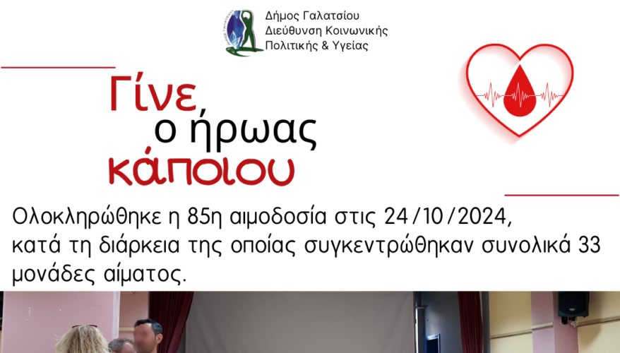 Με μεγάλη επιτυχία ολοκληρώθηκε η 85η αιμοδοσία του Δήμου Γαλατσίου, την Πέμπτη 24/10/2024 στην Αίθουσα Πνευματικού Κέντρου Θάνος Κωτσόπουλος, στο ισόγειο του Δημαρχείου.