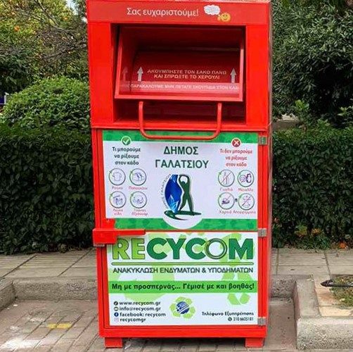 Ο Δήμος Γαλατσίου είναι στην ευχάριστη θέση να ανακοινώσει την τοποθέτηση των τελευταίων δέκα (10) κόκκινων κάδων ανακύκλωσης ρούχων, υποδημάτων, αξεσουάρ και λευκών ειδών σε συνεργασία με την εταιρία RECYCOM. Υπολογίζεται ότι κάθε πολίτης της Ευρωπαϊκής Ένωσης αποσύρει από την ντουλάπα του δεκαπέντε κιλά ρουχισμού κάθε χρόνο. Στα αστικά στερεά απόβλητα περιέχονται ποσότητες αποβλήτων ρουχισμού (ρούχα, λευκά είδη, τσάντες, παπούτσια κλπ), οι οποίες προσεγγίζουν περίπου το 3% κατά βάρος.