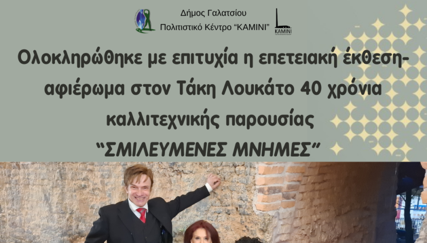 Ένα ξεχωριστό επετειακό αφιέρωμα στον πολυτάλαντο Τάκη Λουκάτο και τη χοροθεατρική ομάδα του Μεταμορφώσεις , πραγματοποιήθηκε στο Πολιτιστικό Κέντρο Δήμου Γαλατσίου ΚΑΜΙΝΙ συγκεντρώνοντας πολλούς φίλους και θαυμαστές του από το χώρο της τέχνης, της γραφής και δημοσιογραφίας, της εκπαίδευσης και του επιχειρείν αλλά και απλούς φιλότεχνους. Στο πλαίσιο του αφιερώματος στα 40 χρόνια καλλιτεχνικής προσφοράς του Τάκη Λουκάτου έγινε παρουσίαση του 1ου θεατρικού έργου-βιβλίου του με τη συμμετοχή γνωστών δημοσιογράφων και καλλιτεχνών καθώς και τα εγκαίνια αναδρομικής εικαστικής έκθεσης γλυπτών έργων του που συνεχίζεται στον απόλυτα ταιριαστό πέτρινο χώρο εκθέσεων ΚΑΜΙΝΙ, ένα τόπο με ιστορία και υπεύθυνο τον Μάνο Ελευθερίου (έως τις 9 Απριλίου 2025, ώρες 6-8 μ.μ., Ρεθύμνης και Χρήστου Καψάλη 36, Γαλάτσι). Συντονίστρια έκθεσης-εκδηλώσεων: Στέλλα Λιαγούρη, μέλος Δ.Σ. στο ΚΑΜΙΝΙ.