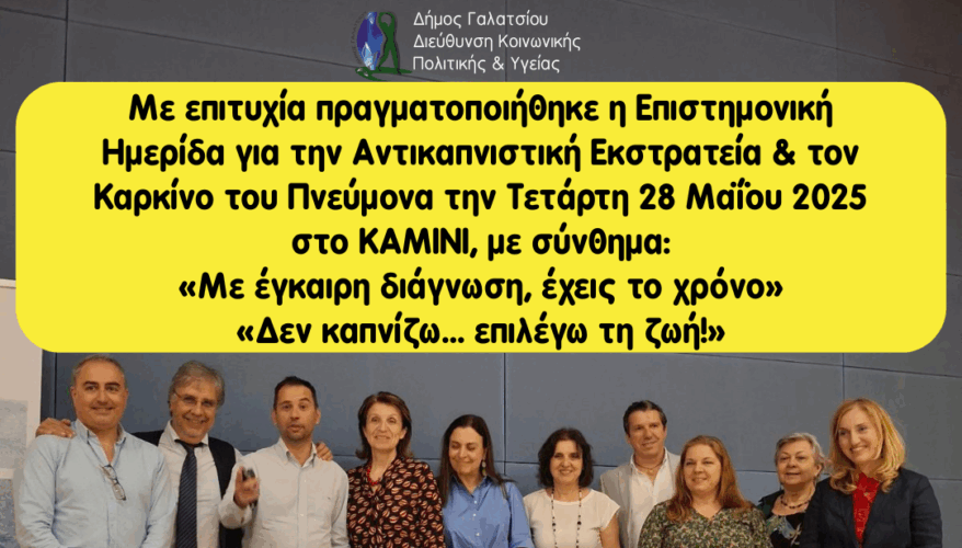 Έτσι, με έναυσμα τον εορτασμό της Παγκόσμιας Ημέρας κατά του Καπνίσματος που αποτελεί σημαντική αιτία πρόκλησης και αύξησης κρουσμάτων καρκίνου του πνεύμονα, διοργάνωσε Επιστημονική Ημερίδα για την «Αντικαπνιστική Εκστρατεία & τον Καρκίνο του Πνεύμονα: «Με έγκαιρη διάγνωση, έχεις το χρόνο», «Δεν καπνίζω .. επιλέγω την ζωή!». Η Ημερίδα πραγματοποιήθηκε σε συνεργασία με το Σύλλογο Δράση για την Κοινωνία, τον Πολιτισμό και την Ποιότητα Ζωής και υπό την Αιγίδα του Δήμου Γαλατσίου την Τετάρτη 28 Μαΐου 2025 στο ΚΑΜΙΝΙ Πολιτιστικό Κέντρο του Δήμου Γαλατσίου (Ρεθύμνης και, Χρήστου Καψάλη 36, Γαλάτσι 111 46) με ελεύθερη είσοδο.