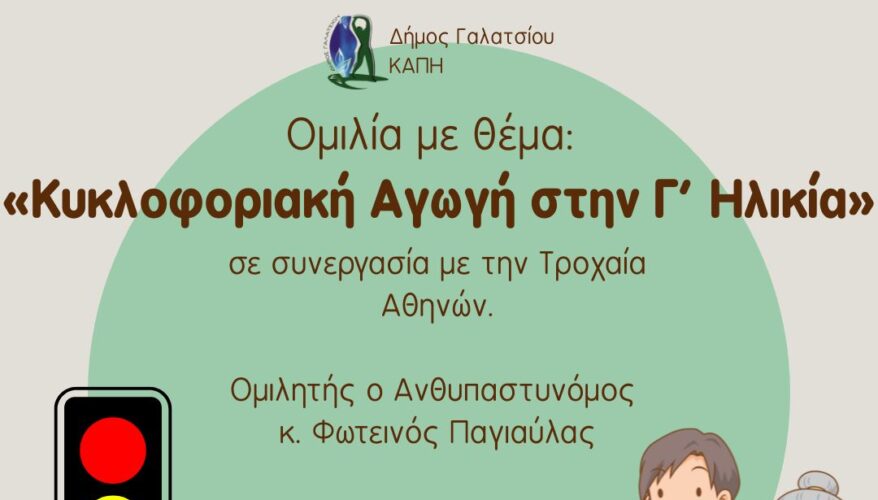 Τη Δευτέρα 26 Μαΐου 2025, στις 11:00, στο Β ΄ΚΑΠΗ, (Πυθαγόρα 7, πλησίον Δημαρχείου) θα πραγματοποιηθεί ενημερωτική ομιλία με θέμα: «Κυκλοφοριακή Αγωγή στην Γ΄ Ηλικία», σε συνεργασία με την Τροχαία Αθηνών.