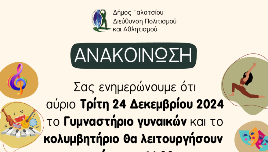 Σας ενημερώνουμε ότι αύριο Τρίτη 24 Δεκεμβρίου 2024 το Γυμναστήριο γυναικών και το κολυμβητήριο θα λειτουργήσουν μέχρι τις 14:00, ενώ το Κέντρο Καλλιτεχνικών Δραστηριοτήτων & Εκπαίδευσης θα παραμείνει κλειστό