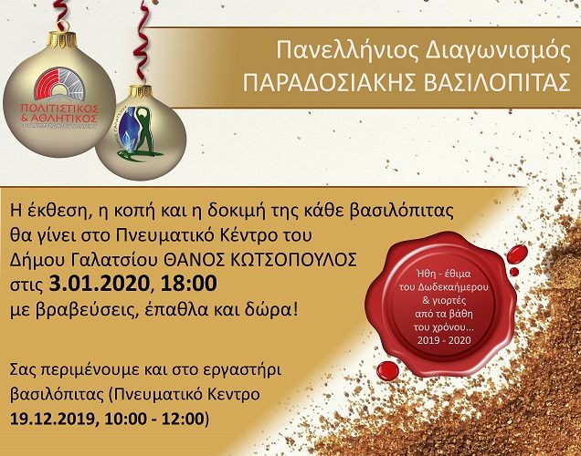Η έκθεση, η κοπή και η δοκιμή της κάθε βασιλόπιτας θα γίνει στο Πνευματικό Κέντρο του Δήμου Γαλατσίου ΘΑΝΟΣ ΚΩΤΣΟΠΟΥΛΟΣ την Παρασκευή 3 Ιανουαρίου 2020, με βραβεύσεις, έπαθλα και δώρα!