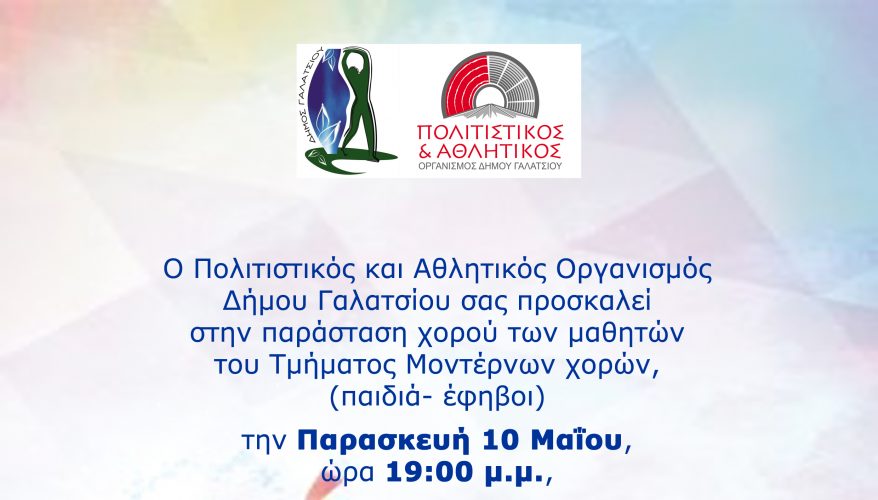 Ο Πολιτιστικός και Αθλητικός Οργανισμός Δήμου Γαλατσίου διοργανώνει παράσταση χορού με τους μαθητές του Τμήματος Μοντέρνων χορών (παιδιά- έφηβοι), την Παρασκευή 10 Μαΐου, ώρα 19:00 μ.μ., στο Πολιτιστικό κέντρο «Καμίνι» (Ρεθύμνης 36 και Καραϊσκάκη). Τα μαθήματα μοντέρνου χορού κάνει η δασκάλα Μαριαλένα Δουράκη στον Χώρο Καλλιτεχνικών Δραστηριοτήτων στο ΠΑΛΑΙ.